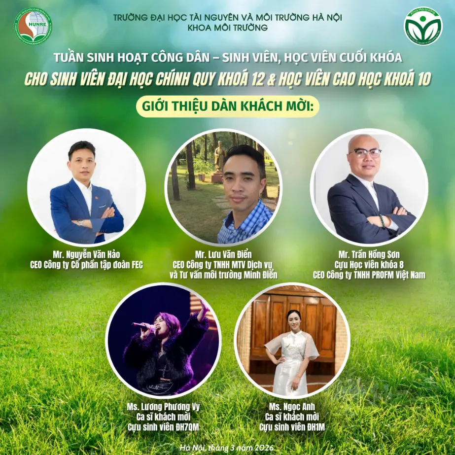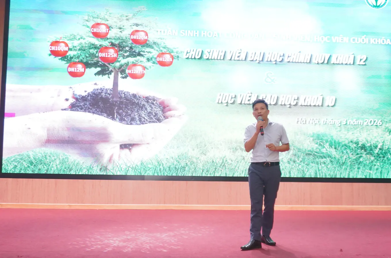 Chiều 31/3/2026, tại Trường Đại học Tài nguyên và Môi trường Hà Nội, Khoa Môi trường tổ chức chương trình “Tuần sinh hoạt công dân – sinh viên, học viên cuối khóa” gắn với hoạt động giới thiệu việc làm cho sinh viên khóa 12 và học viên cao học khóa 10. Sự kiện thu hút gần 500 sinh viên, học viên cùng sự tham gia của nhiều doanh nghiệp, mở ra không gian kết nối trực tiếp giữa người học và nhà tuyển dụng.